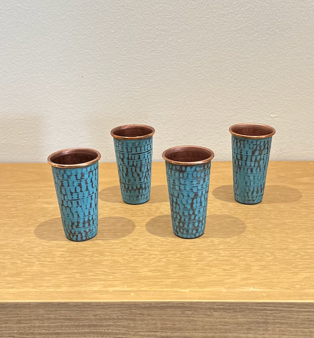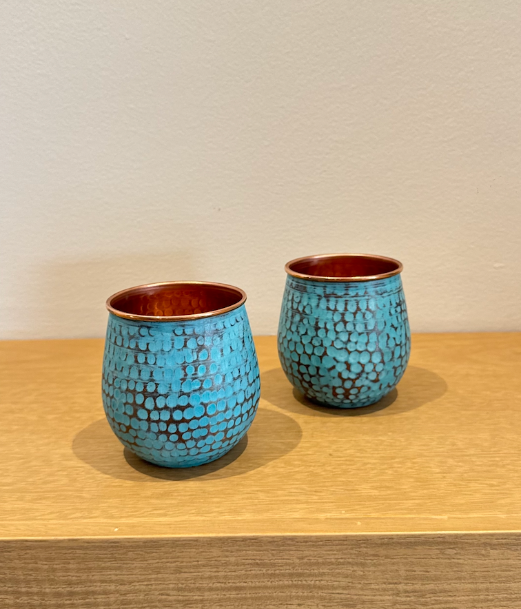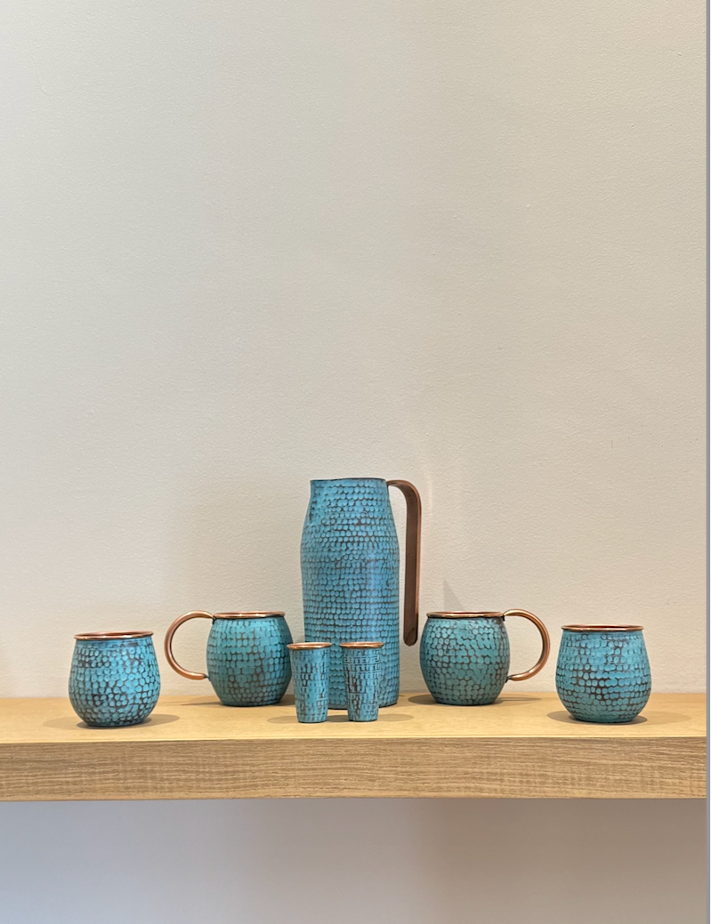 El cobre ha estado presente en los rituales cotidianos: beber, compartir, sanar. Es un metal vivo, con propiedades térmicas y antibacteriales que lo hacen funcional, pero también con una belleza atemporal que se transforma con el uso. Esta colección, hecha a mano por artesanos mexicanos que dominan el oficio con precisión y alma.